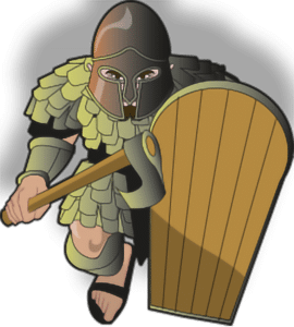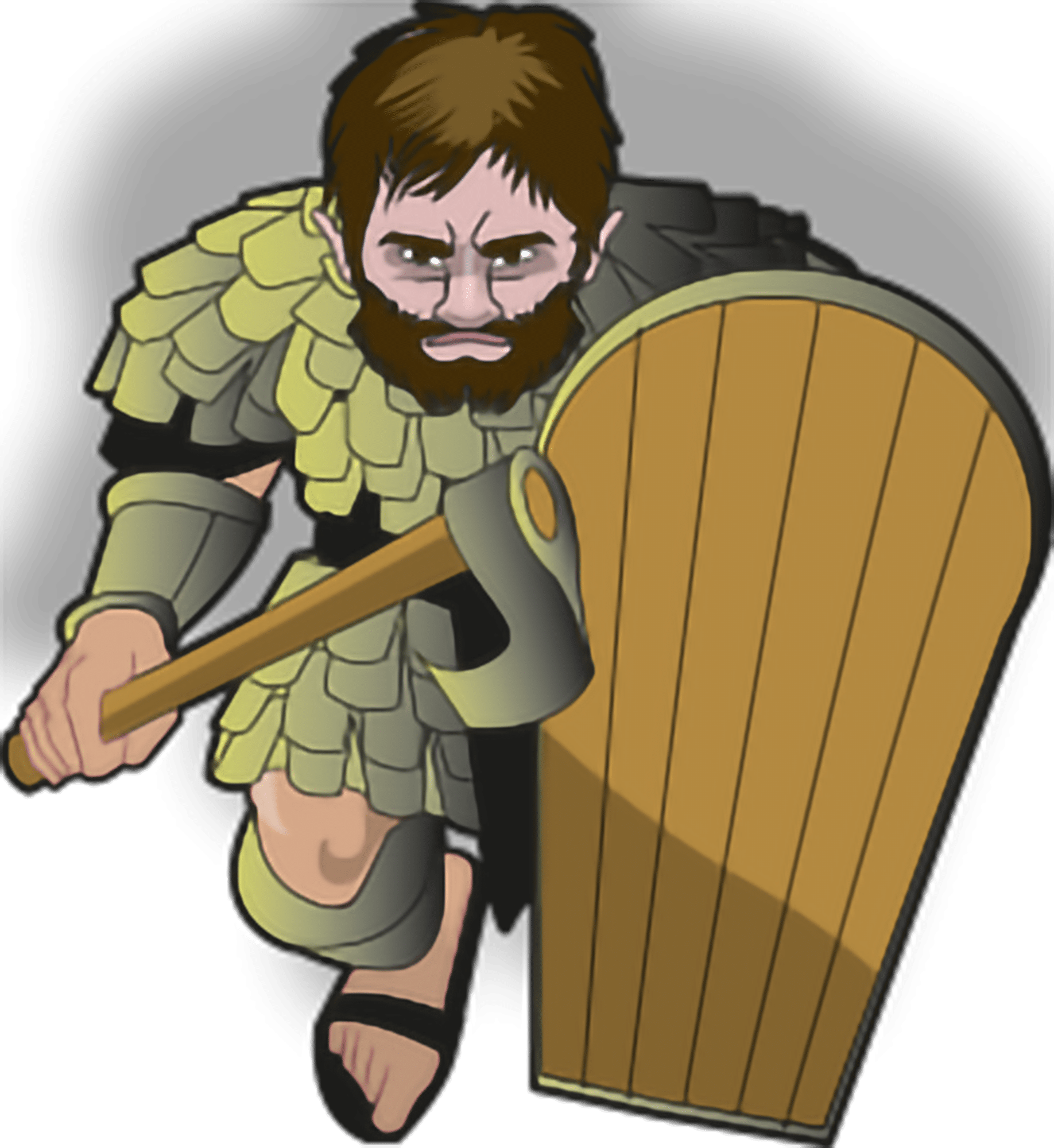 greaves & vambraces. Large wooden shield, 1h axe, sling