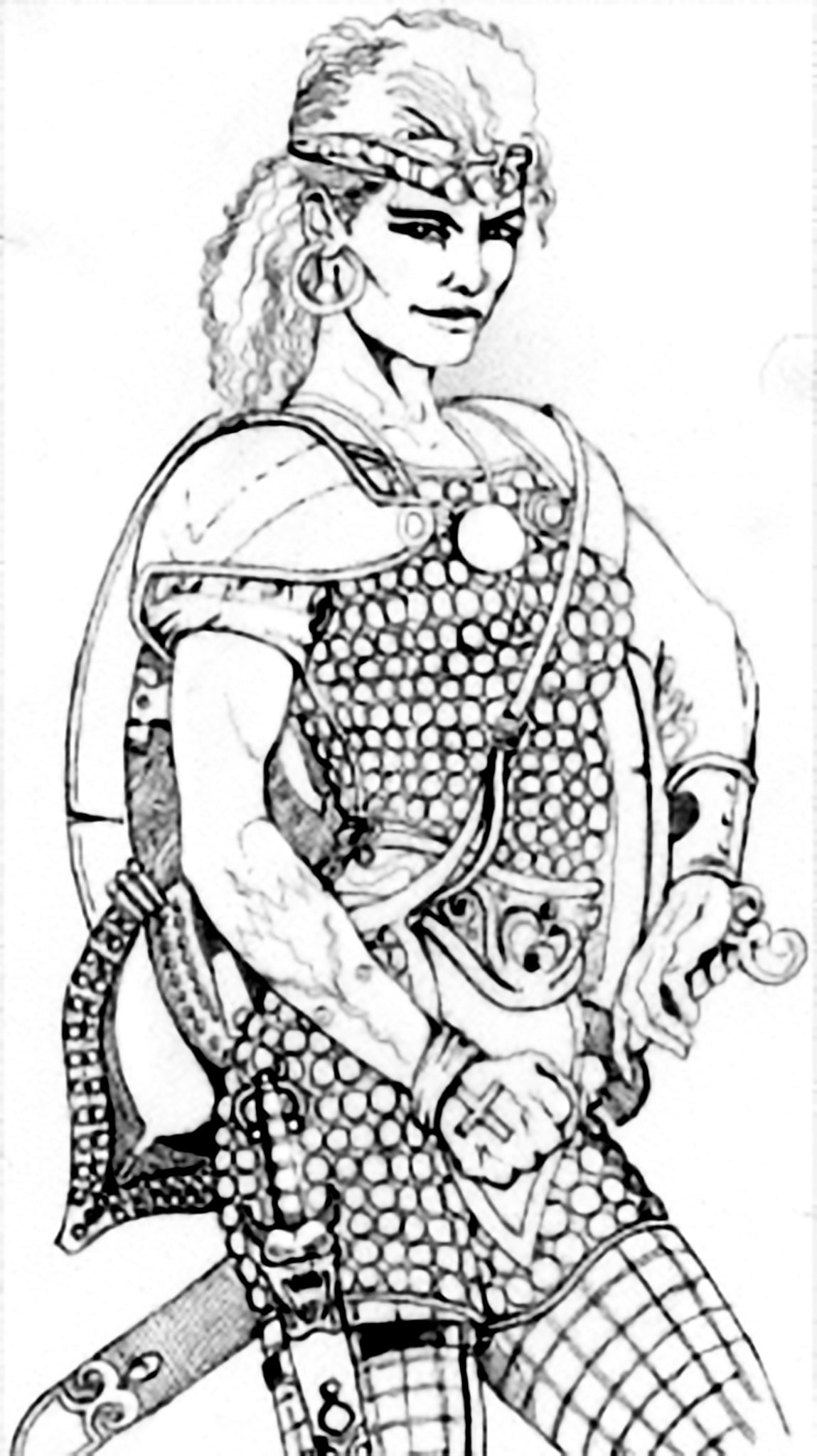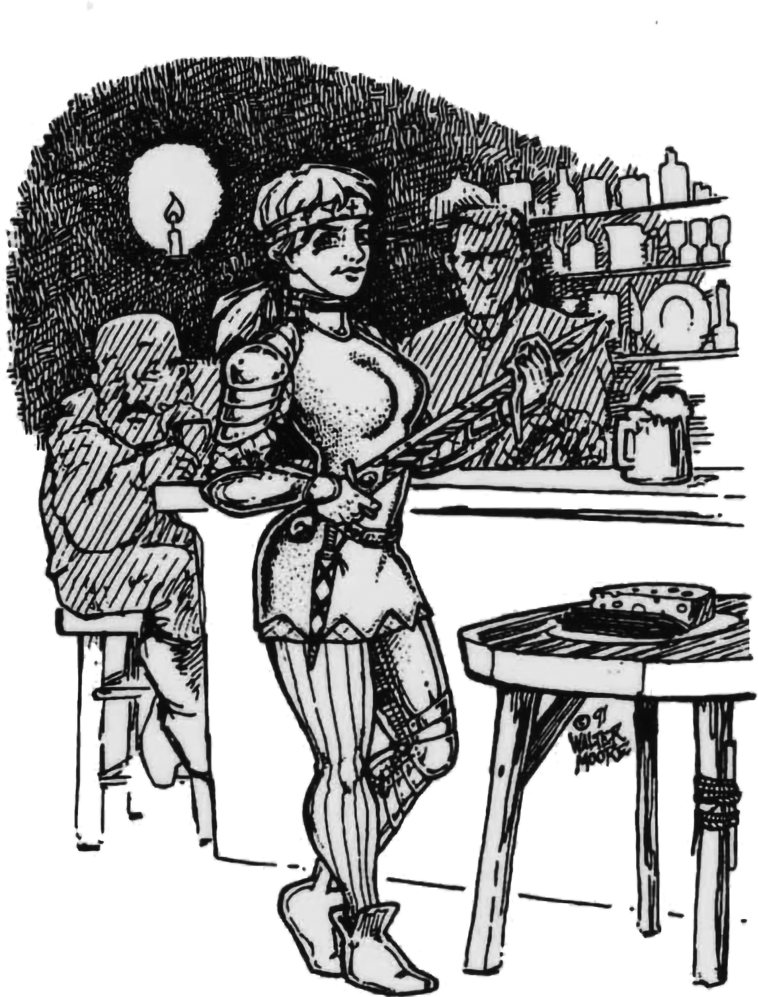 Fram till den tiden klär hon sig som hon brukar, vilket är i en ganska enkel tunika med väl innött läder ovanpå och inte mycket smycken eller något annat, och även om hon är ren och prydlig kommer hon inte att fånga din uppmärksamhet vid första anblicken. Men nu bär hon en klänning som avslöjar en ganska anmärkningsvärd mängd av hennes figur, faktiskt om det inte vore för några halsband skulle mycket lite av hennes bröst vara täckta överhuvudtaget, och hon har på sig örhängen, armband, armringar och jag vet inte vad allt annat, och håret är gjort på ett elegant sätt med stora hårnålar med juveler stuckna igenom det, och den enda påminnelsen om hennes vanliga stil är att hon fortfarande bär sitt lilla svärd, även om hon håller det löst eftersom hon inte har någonstans att hänga det utan att förstöra effekten.